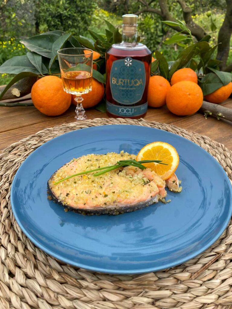 Abbiamo elaborato una fantastica ricetta che mette in risalto la freschezza di Burtuqa: Trancio di Salmone aromatizzato al Burtuqa.