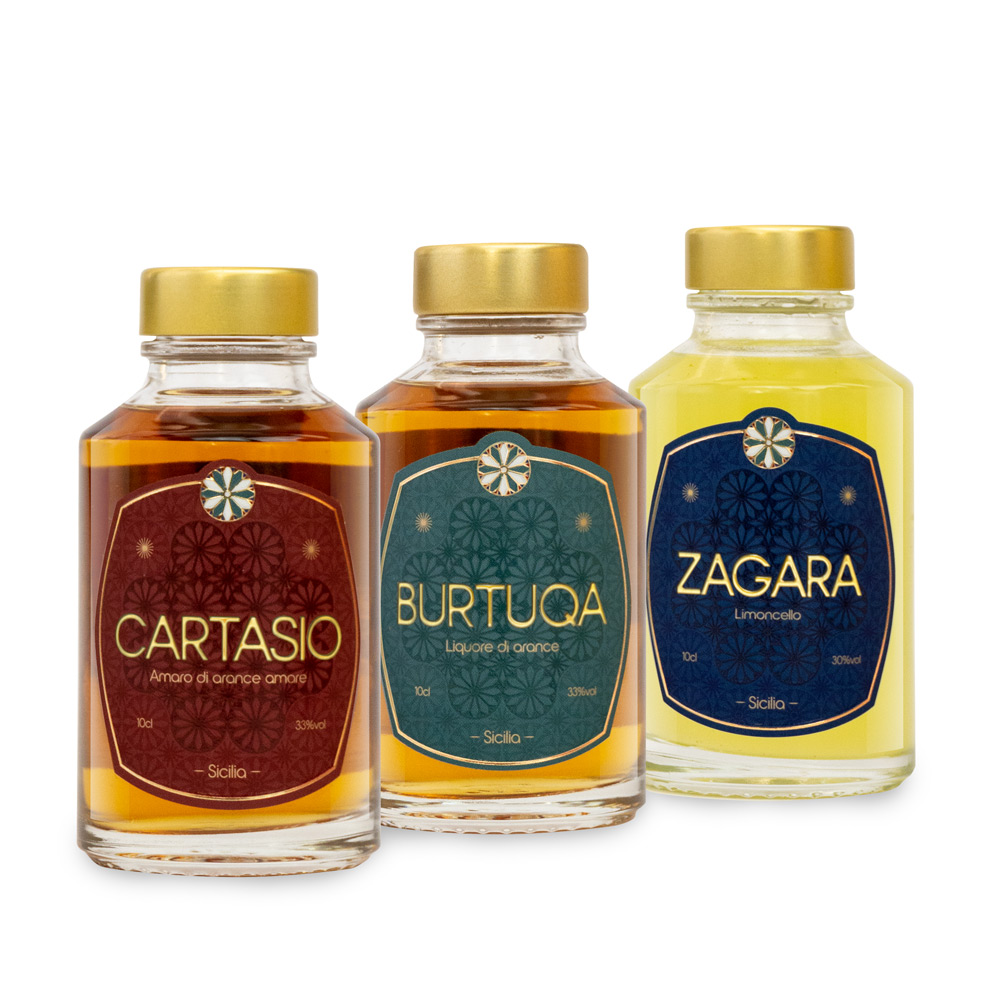 Il set di tre bottiglie comprende Cartasio, l’amaro di arance amare, Burtuqa, il liquore di arance e Zagara, il limoncello.